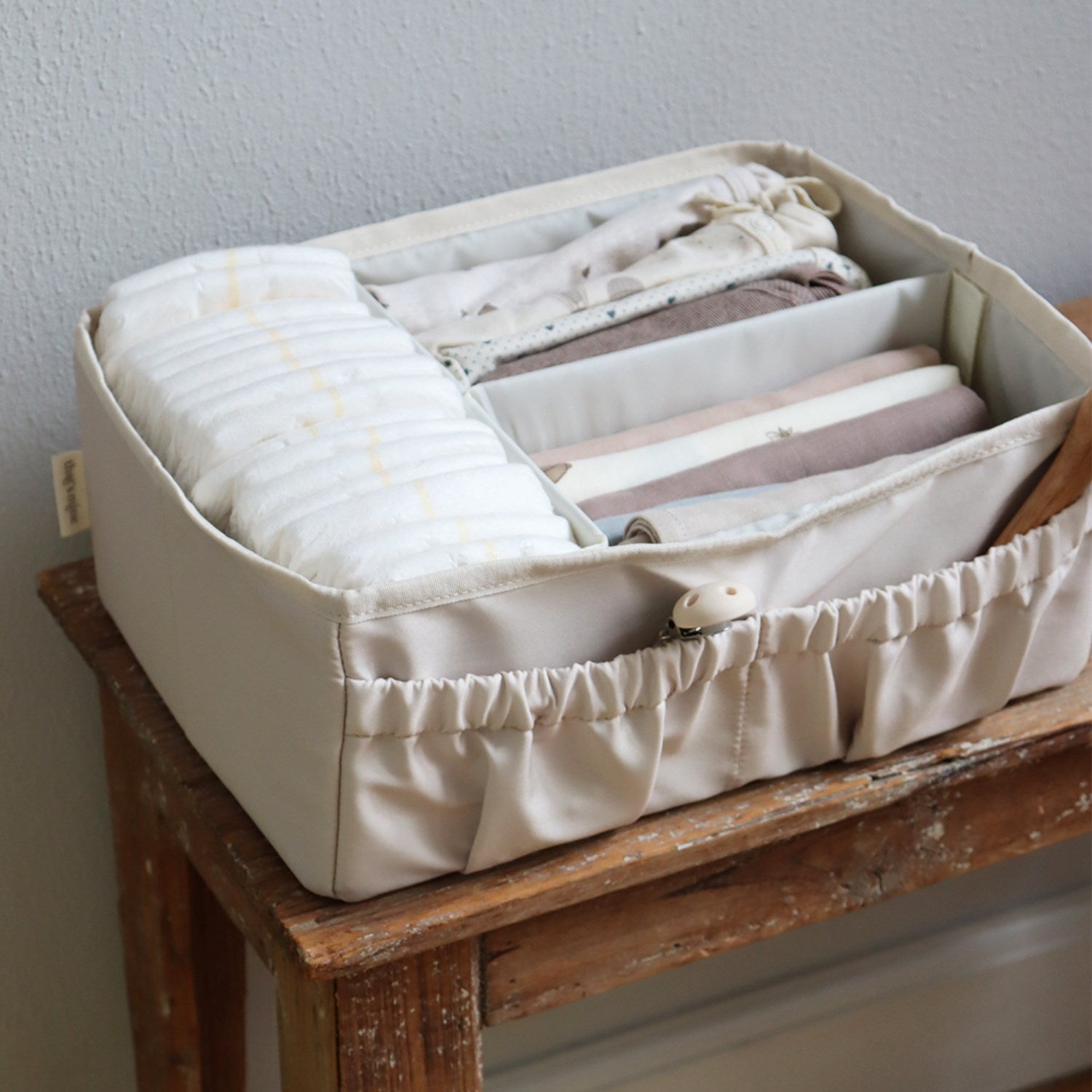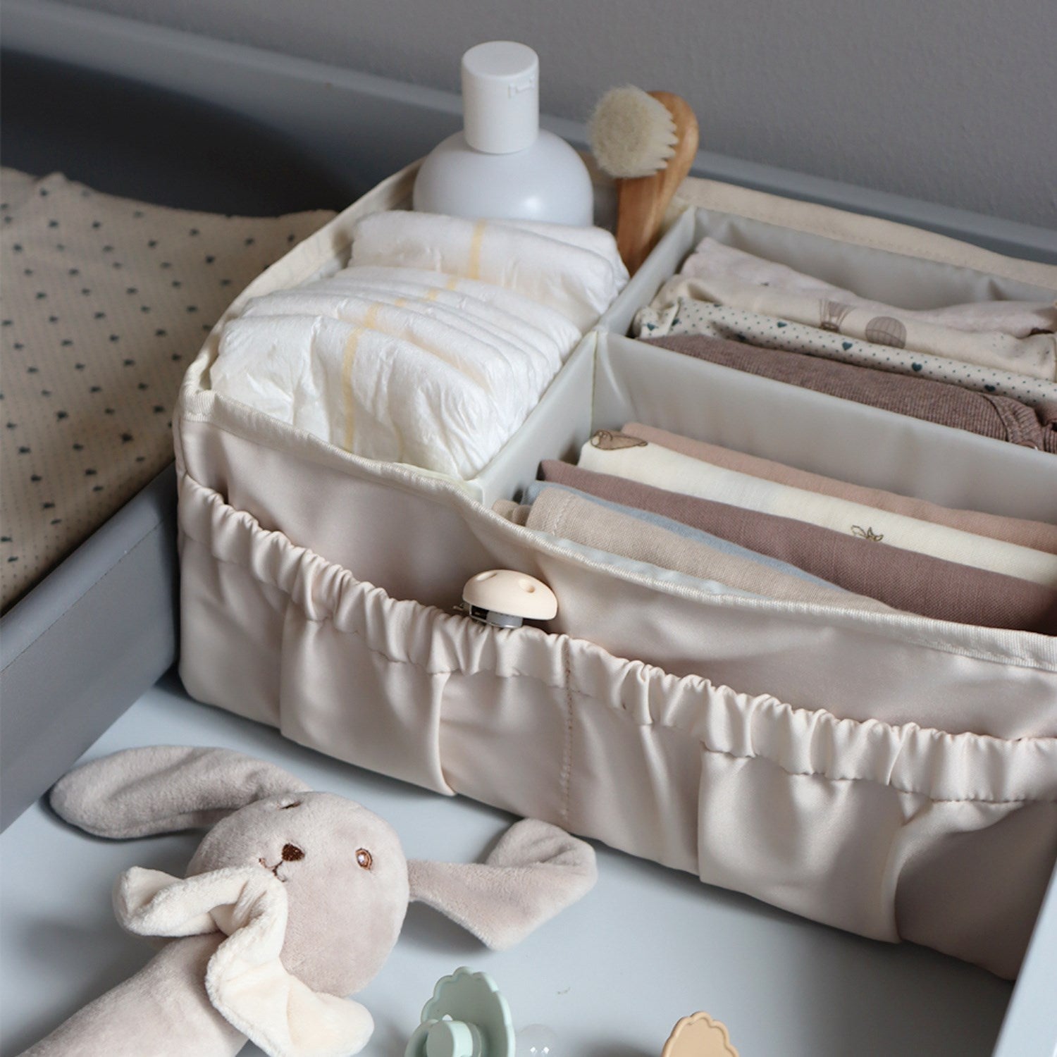Med justerbare skillevægge og lommer i forskellige størrelser kan du nemt sortere alt fra bleer til plejeprodukter. Den holdbare konstruktion sikrer langvarig brug, mens evnen til nemt at folde den sammen og opbevare den reducerer rod og stress i din dagligdag.