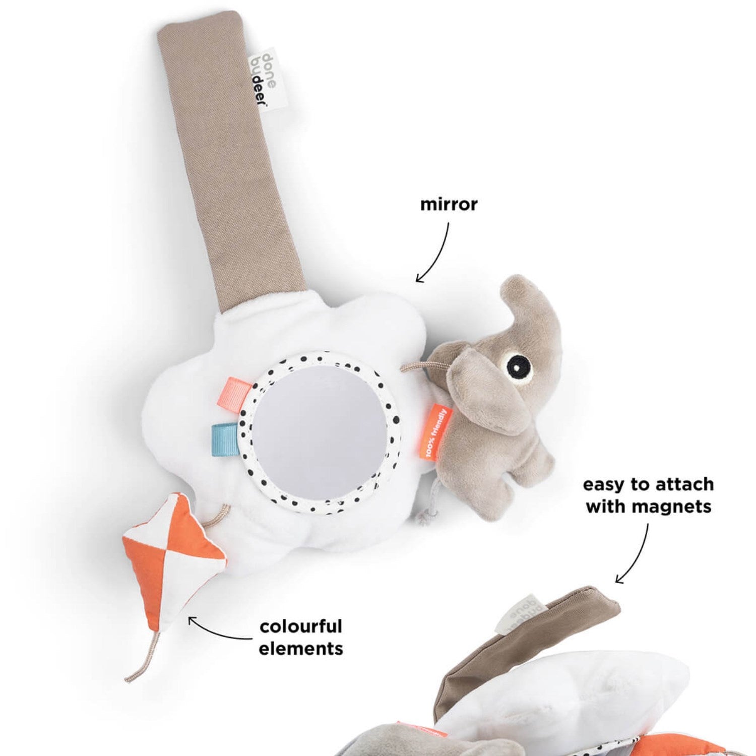 Lad dit barn nyde synet af Elphee, dragen og refleksionerne i spejlet, mens I er på farten. Uroen er let at fastgøre på barnevognen med den magnetiske vedhæftning og tilbyder lyse farver og sjove kontraster, der stimulerer visuelt.