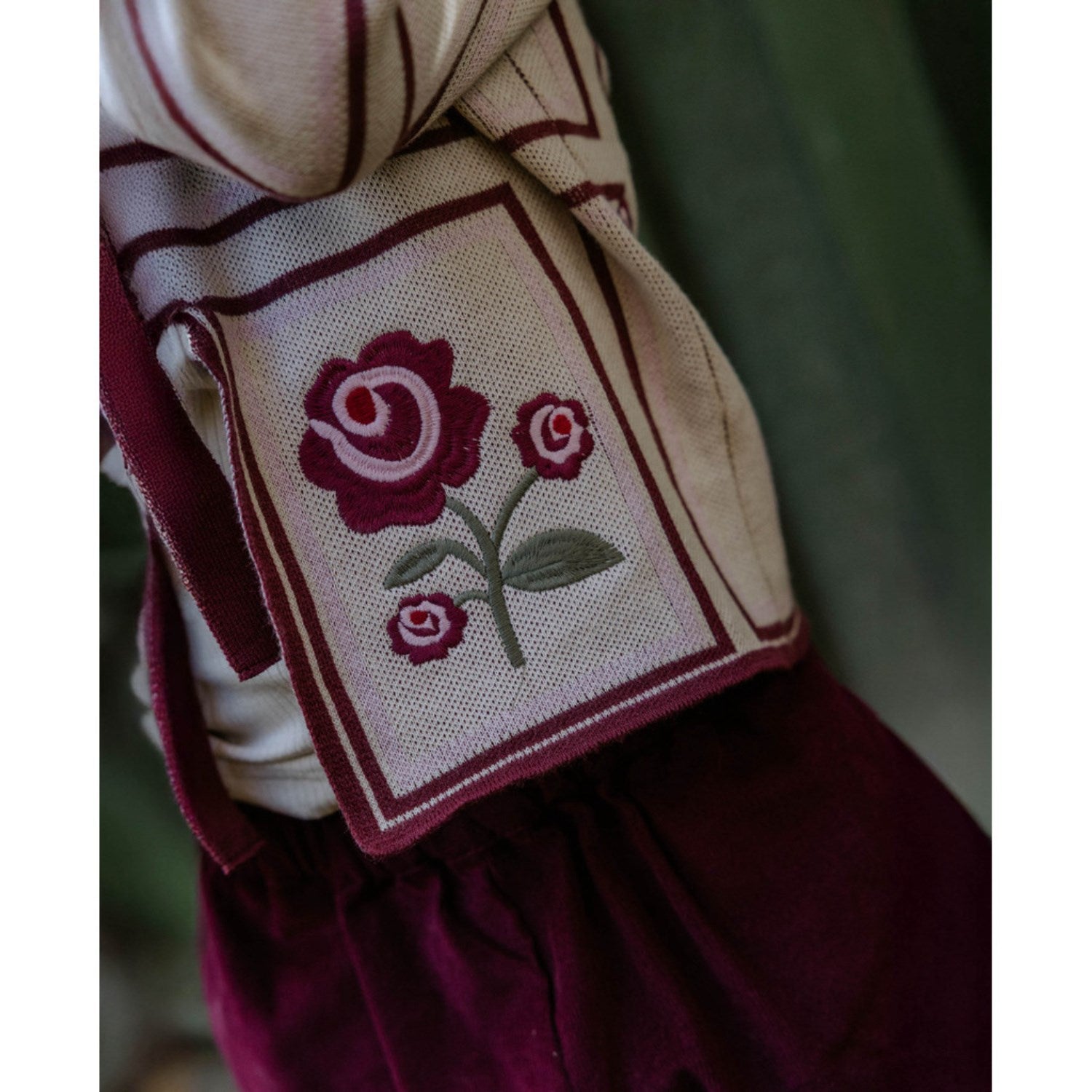 Dyk ned i elegance med vores Fliink Sandshell/Burgendy Charlotte Embroidered Cardigan. Denne smukke strikkede cardigan har et fortryllende design med båndlukning foran, der komplimenterer det elegante udtryk. De fine broderede roser og bordeauxrøde accenter tilføjer et klassisk touch til looket.