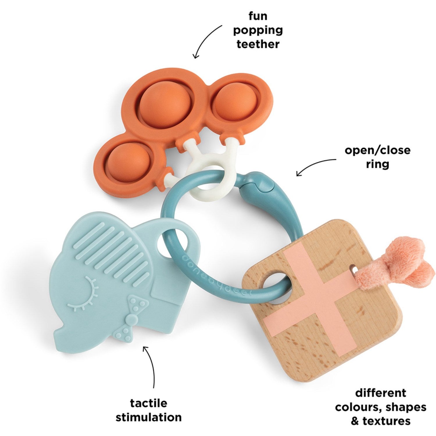 Bring leg og læring sammen med DonebyDeer Celebration Colour Mix Sanse- & Aktivitetsring. Denne alsidige ring er designet til at stimulere dit barns sanser gennem taktil, auditiv og visuel leg. Med forskellige teksturer, farver og former opfordrer den til udforskning og lindrer ømt tandkød.