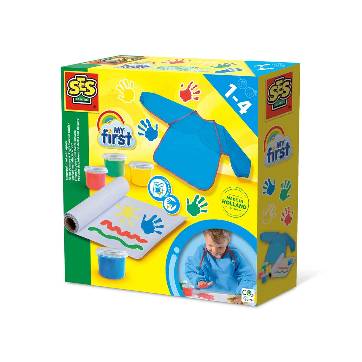 Indhold: 4 x fingermaling (gul, rød, blå, grøn), forklæde, papirrulle (2 meter).