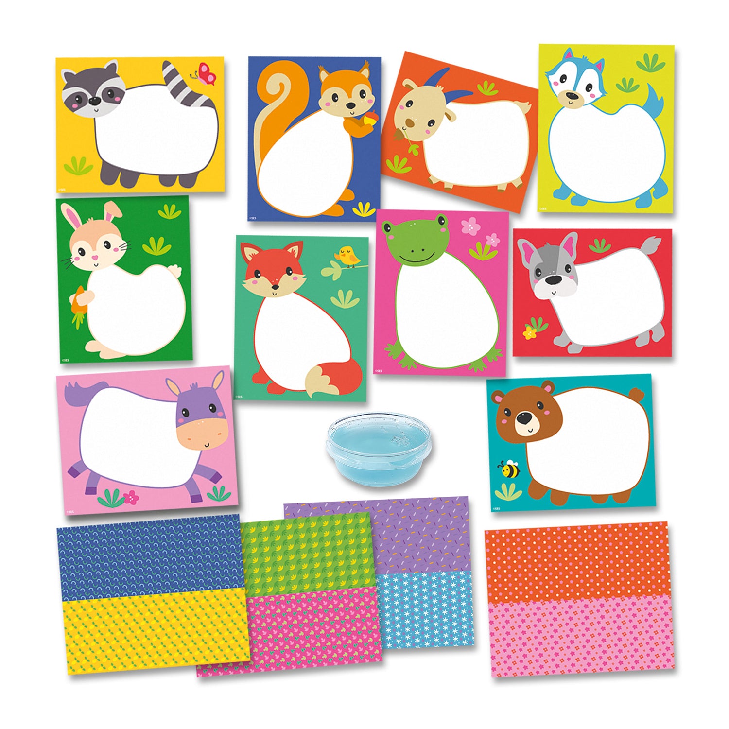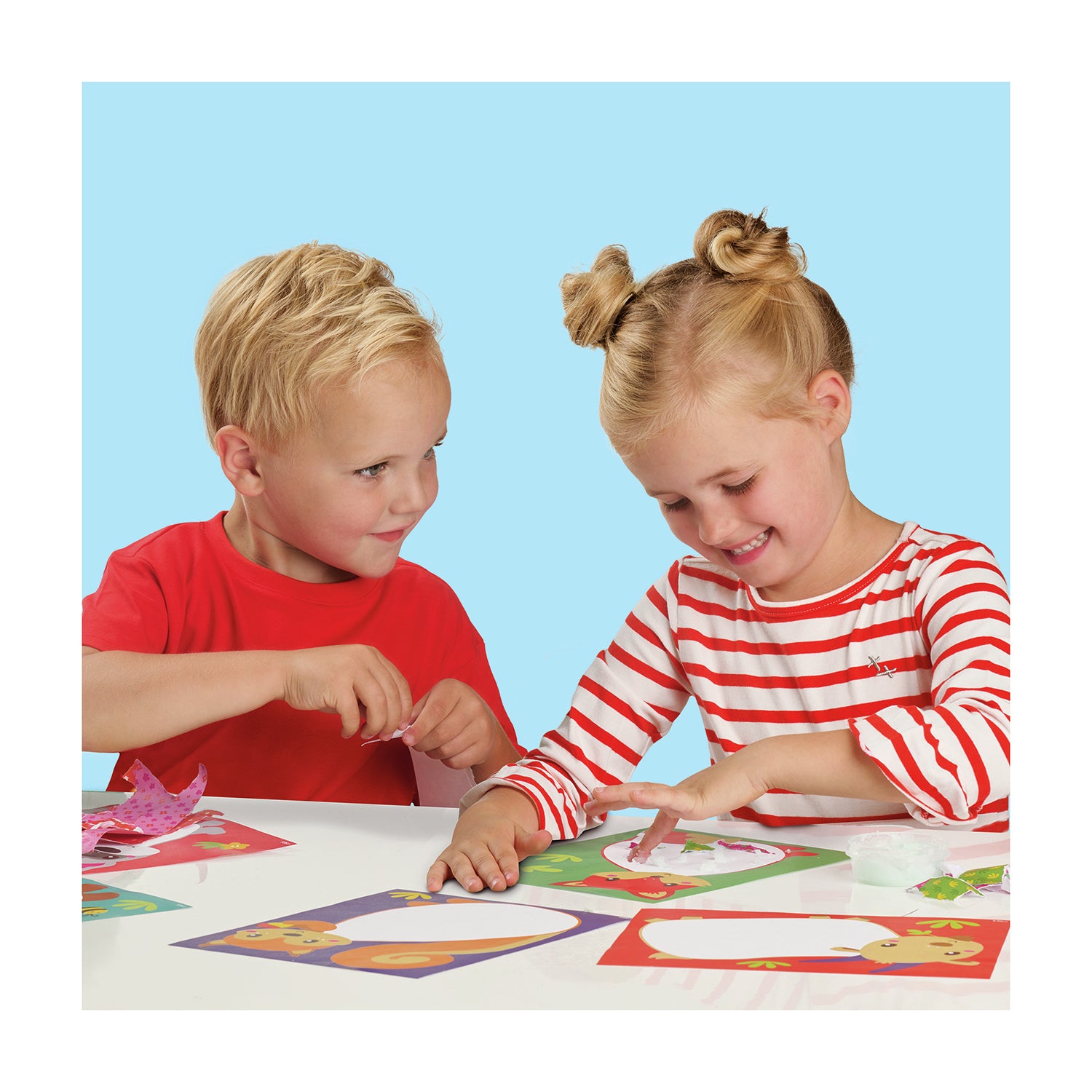 Indhold: 10 x store fortrykte ark, 4 x fortrykte ark til at afrive og klæbe, 1 x tube fingerlim (45ml).