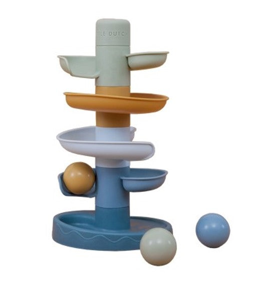 Lad bolden rulle! Det fascinerende spiraltårn søger for masser af spænding. Det farverige legetøj består af 5 bløde dele der er lette at stable for barnet. Slip kuglerne en efter en på toppen og se hvordan hver af dem snor sig og ruller ned. Spiraltårnet forbedrer hånd-øje-koordination og lærer barn om årsag virkning hvilket sikrer, at det er både sjovt og lærerigt. Spiraltårnet kommer med tre store bolde der er lette at holde om og giver lidt lyd når de bevæger sig.