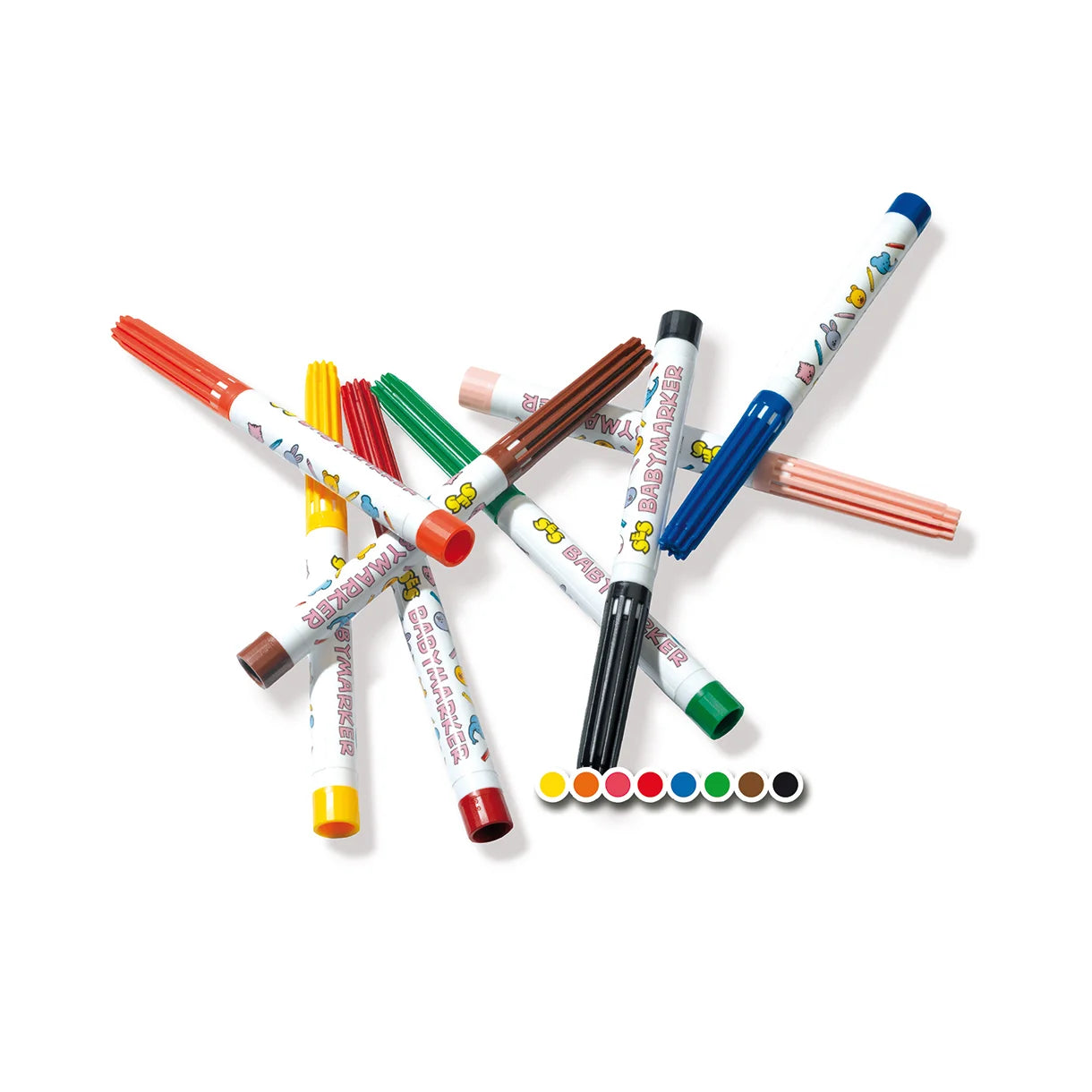Flotte farvetuscher til små børn med børnesikret ventileret prop. Tuscherne har en rund ende, så de ikke bliver ødelagt så let.