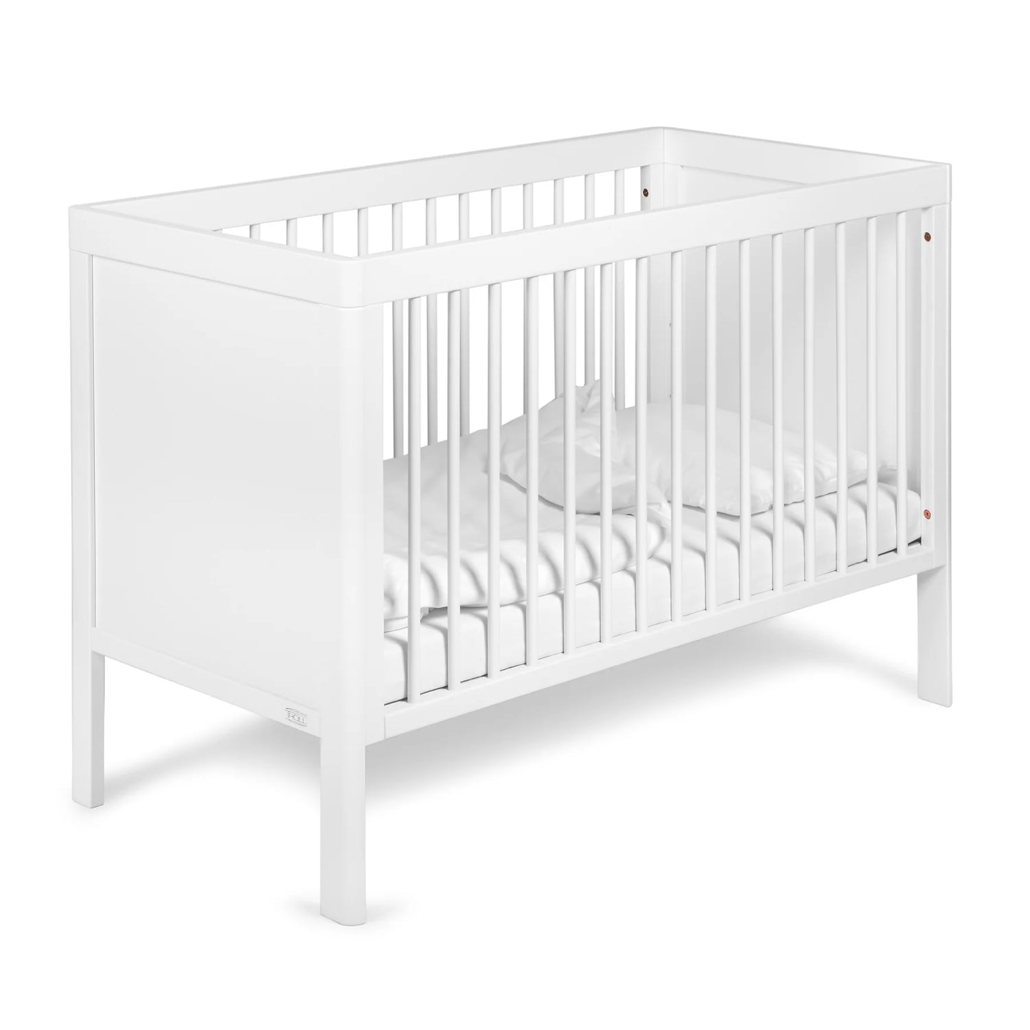 Fin hvid tremmeseng fra Troll. Dette er lukas modellen, som kan laves op til en sofa.