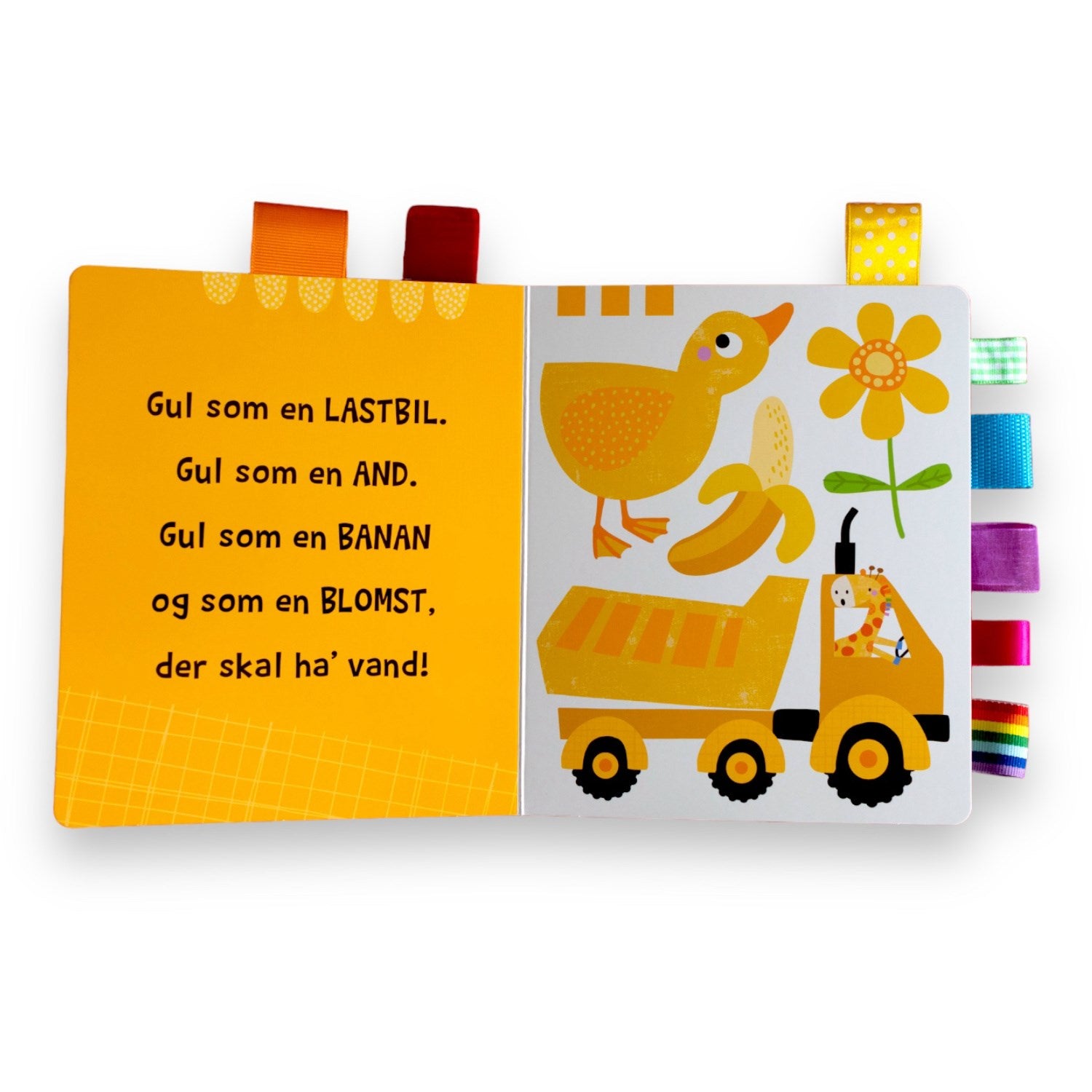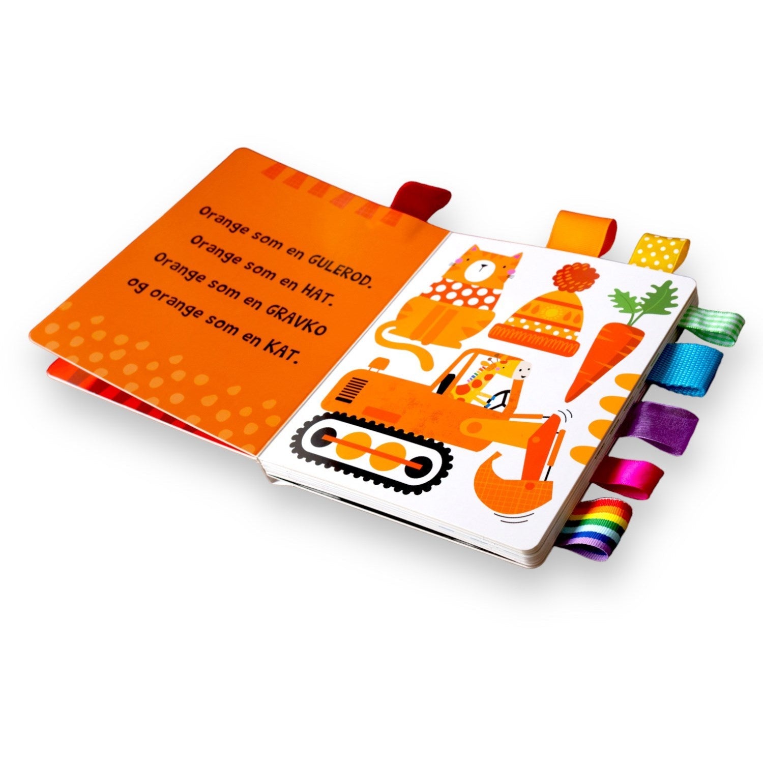 I "Bolden Regnbuefarver" vil børnene blive præsenteret for syv forskellige farver - rød, orange, gul, grøn, blå, lilla og pink - hver introduceret gennem et unikt stof-faneblad. Hver side byder på smukke illustrationer af genstande fra børnenes hverdag samt charmerende rim, der gør læring sjov og interaktiv. De bløde silkebånd tilføjer en taktil dimension, der er ideel til udvikling af finmotorikken.