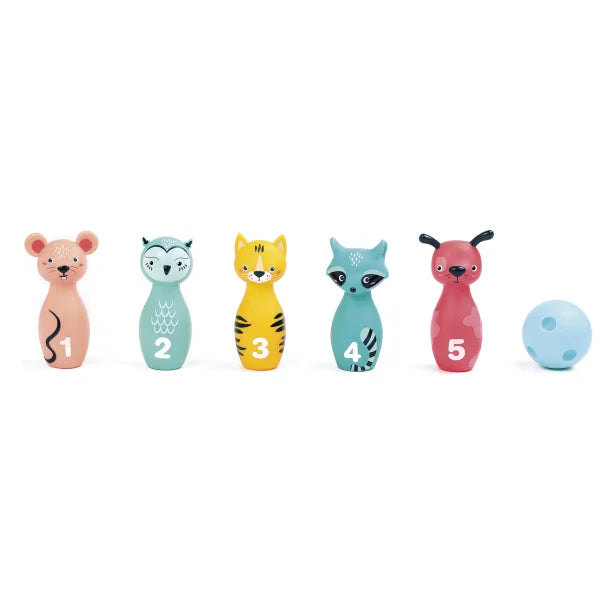 Farverigt bowlingsæt med dyre-kegler. Dette bowlingsæt har et sjovt, børnevenligt design og giver masser af sjov leg. Barnet får styrket deres motorik og koordination samtidig med, at de har det sjovt. Sættet består af 5 kegler og en 1 bold. Barnet kan spille alene eller sammen med andre. Alder: +10 mdr. Emballage størrelse: 20 x 15 x 14 cm. Produkt størrelse: 6 x 15 x 6 cm. Materiale: PVC