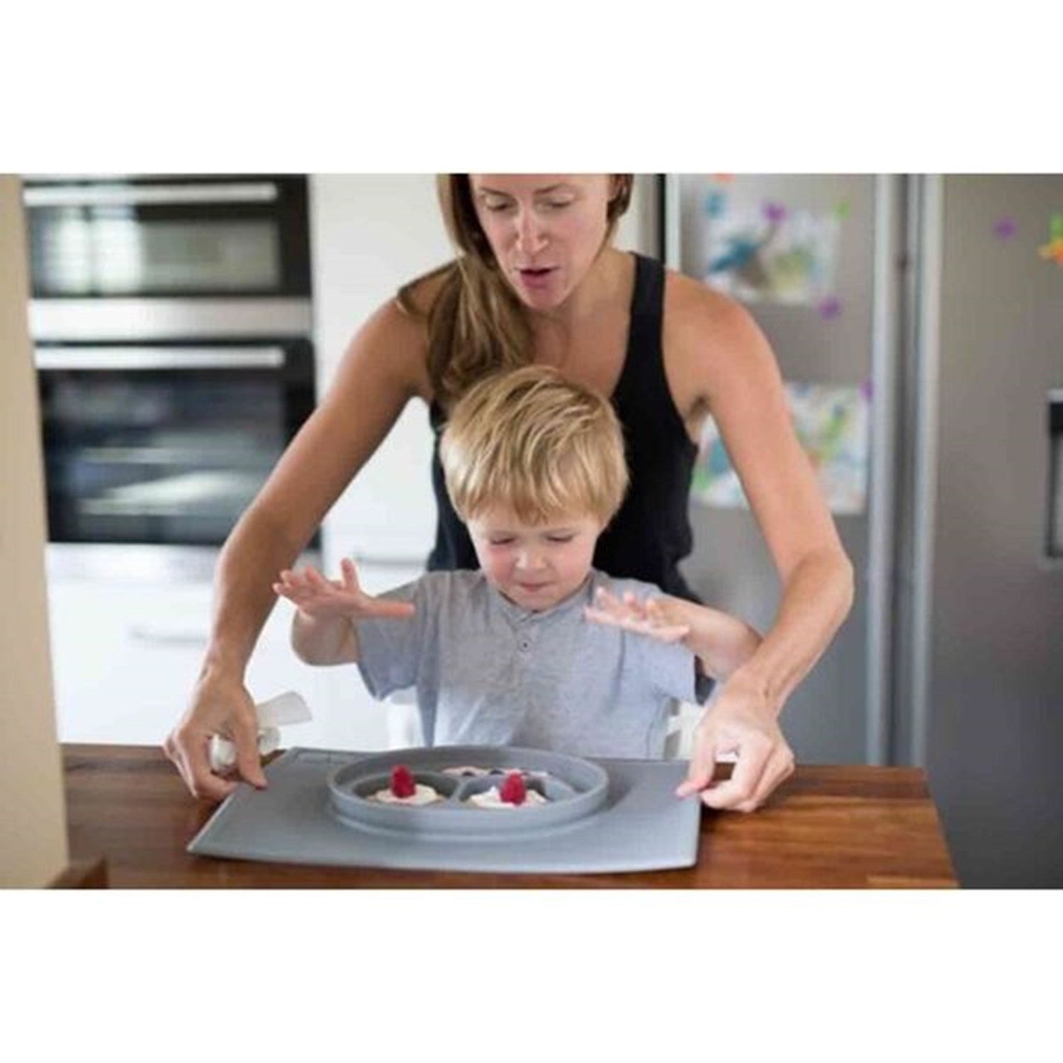 Opdag den geniale EZPZ Happy Mat Dækkeserviet + Plate in One i en smuk gråblå farve. Med dette smarte design får du både en tallerken og en dækkeserviet i ét. Perfekt til børn med portionstørrelser afstemt til deres behov.