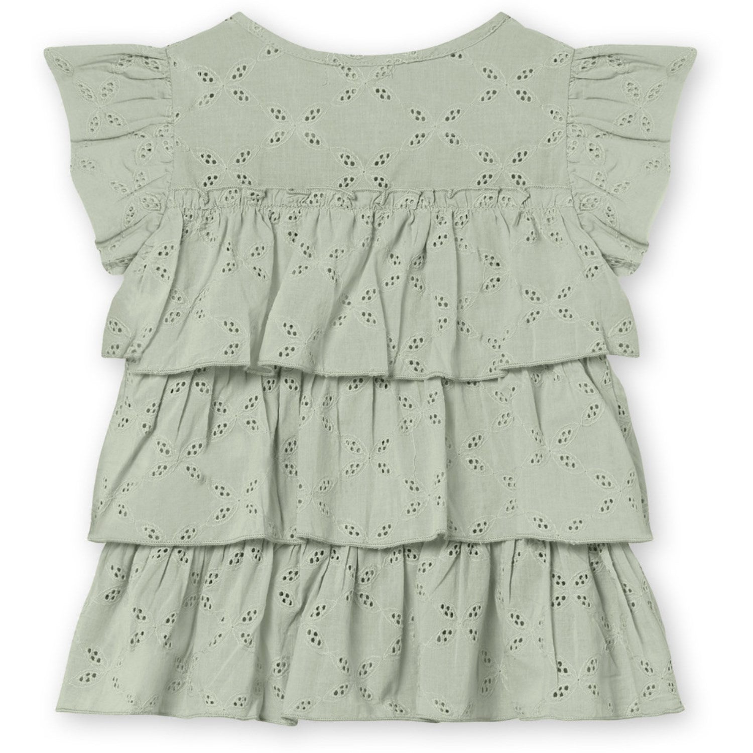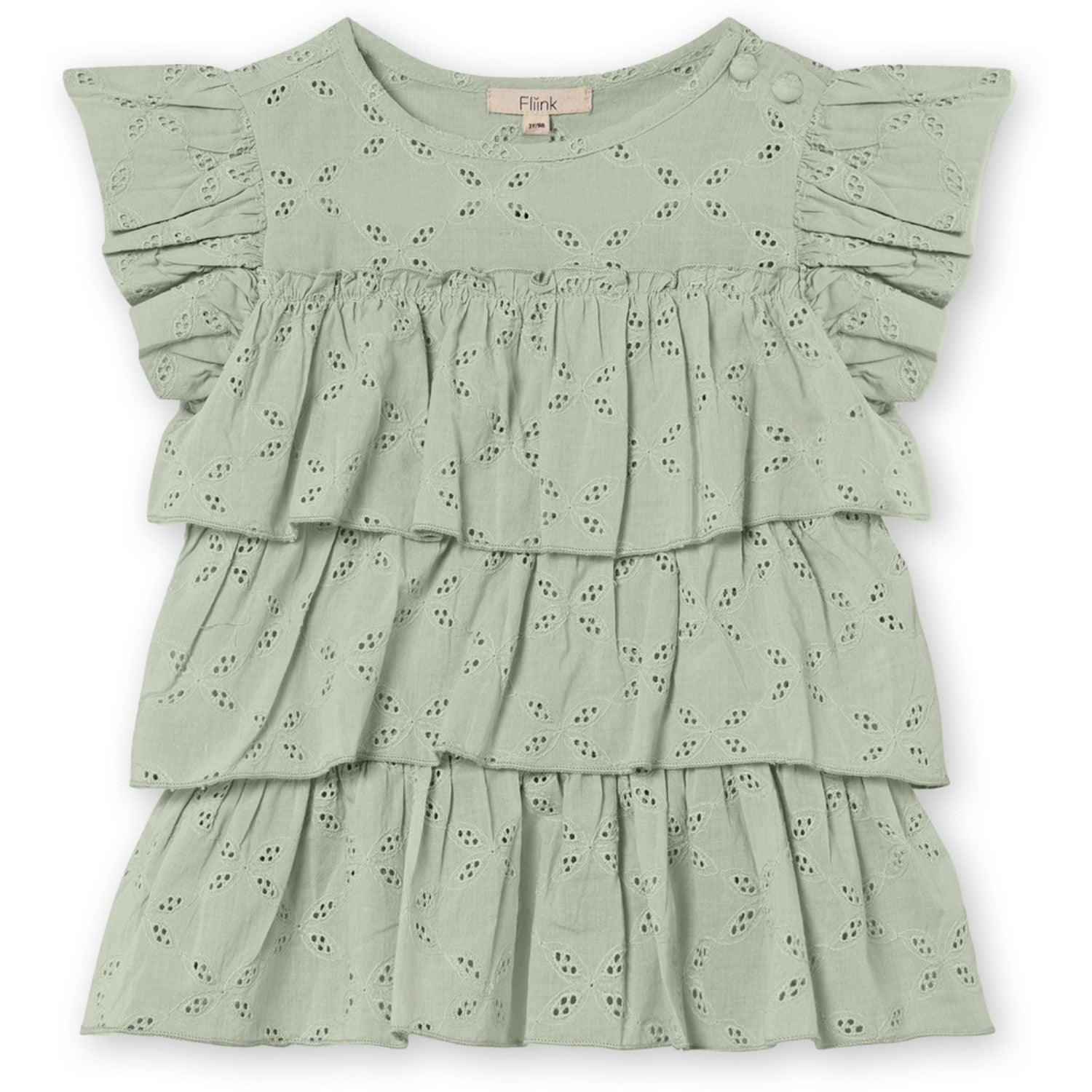 Opdag Fliink Aqua Gray Harper Top - en blød og charmerende top, der vil gøre din lille trendsetter til midtpunktet. Fremstillet i 100% bomuld med delikat broderie anglaise og fine flæser ved skuldrene, tilføjer denne top et strejf af stil til enhver lejlighed. Det elegante peplum-lag giver et ekstra touch af elegance. Med to stofbeklædte knapper på den ene skulder er denne top nem at tage af og på. Velegnet til maskinvask, så den er let at vedligeholde, og ideel til børns daglige eventyr.