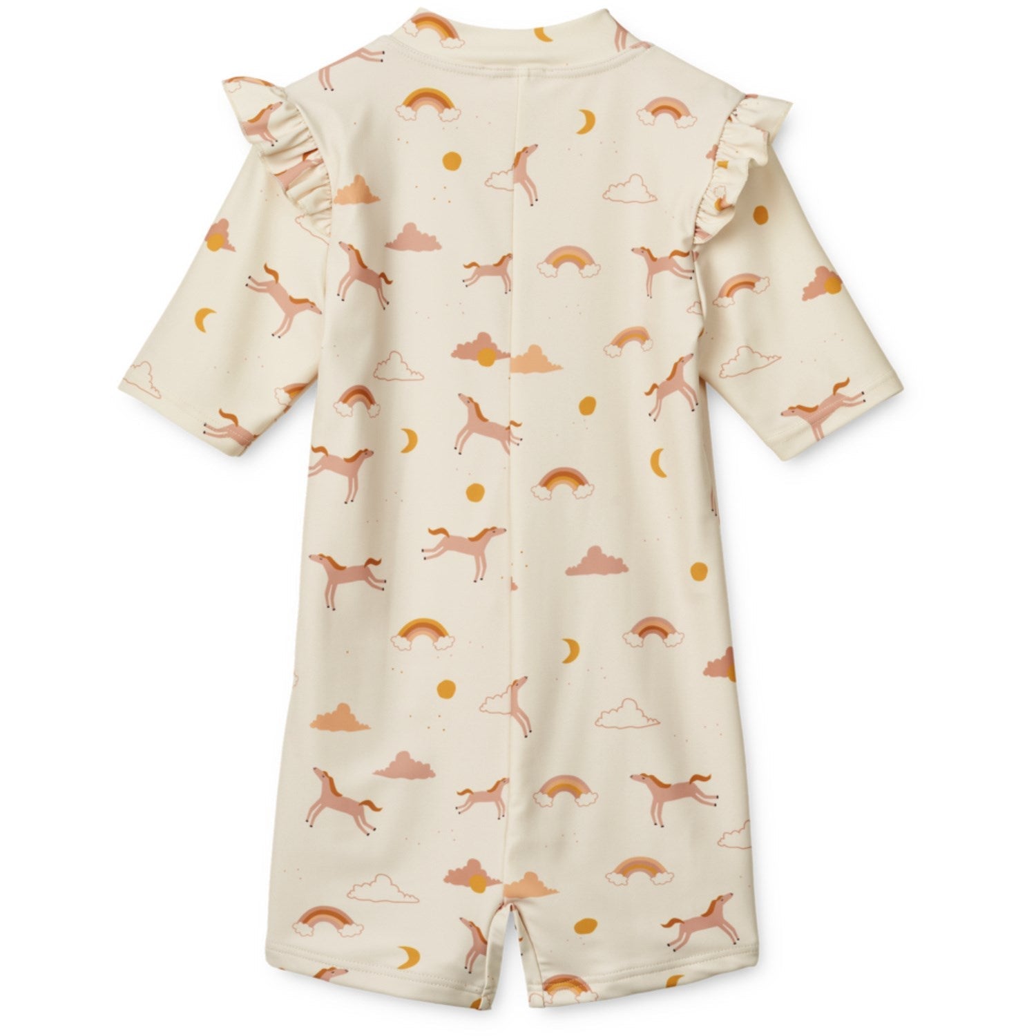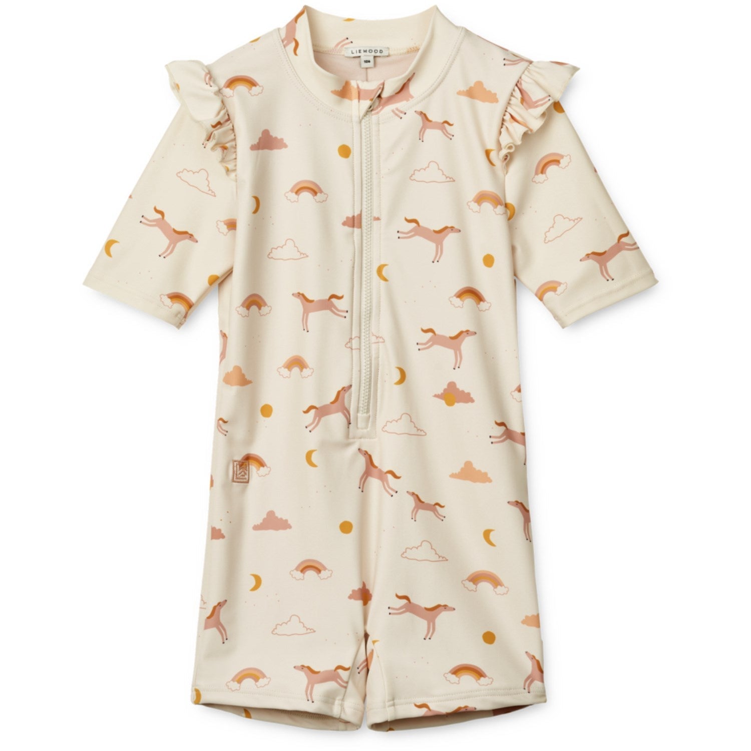 Opdag en ny måde at gøre stranddage sjovere med LIEWOOD Dream / Ecru Amel Printed Badeheldragt. Denne charmerende badeheldragt kombinerer stil og funktionalitet og er lavet af hurtigtørrende genanvendt polyester, der skåner miljøet. Den forreste lynlås gør det let for dit barn at hoppe i og ud af dragten, mens UV-beskyttelsen giver dig ro i sindet under solrige legedage. De livlige sommerfarver og dekorative detaljer tilføjer et strejf af glæde. Perfekt til stranden eller poolen!