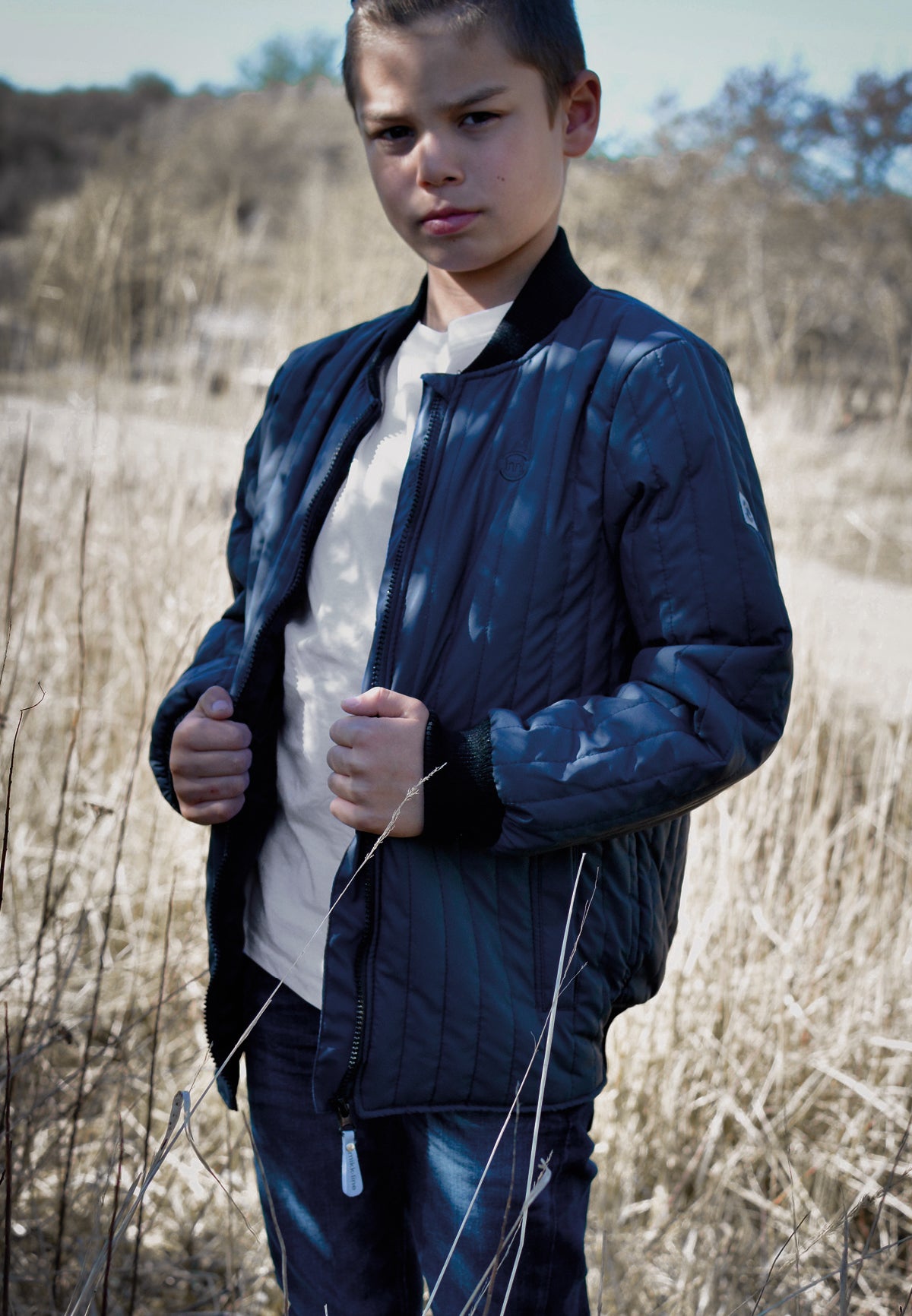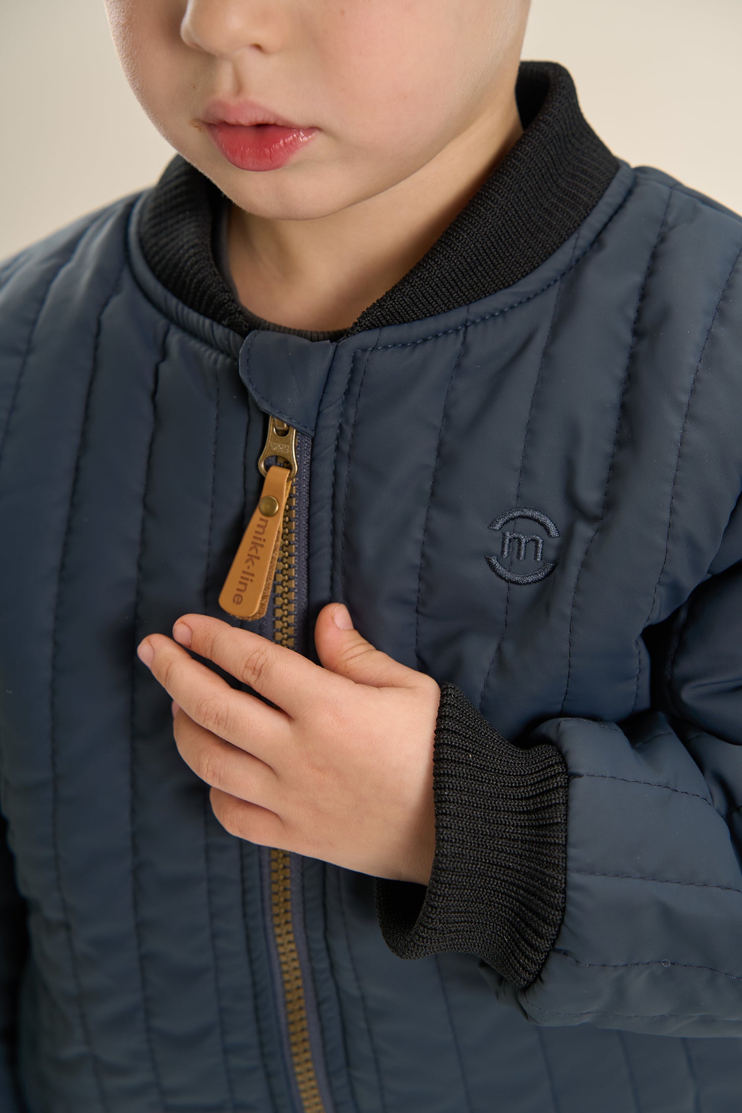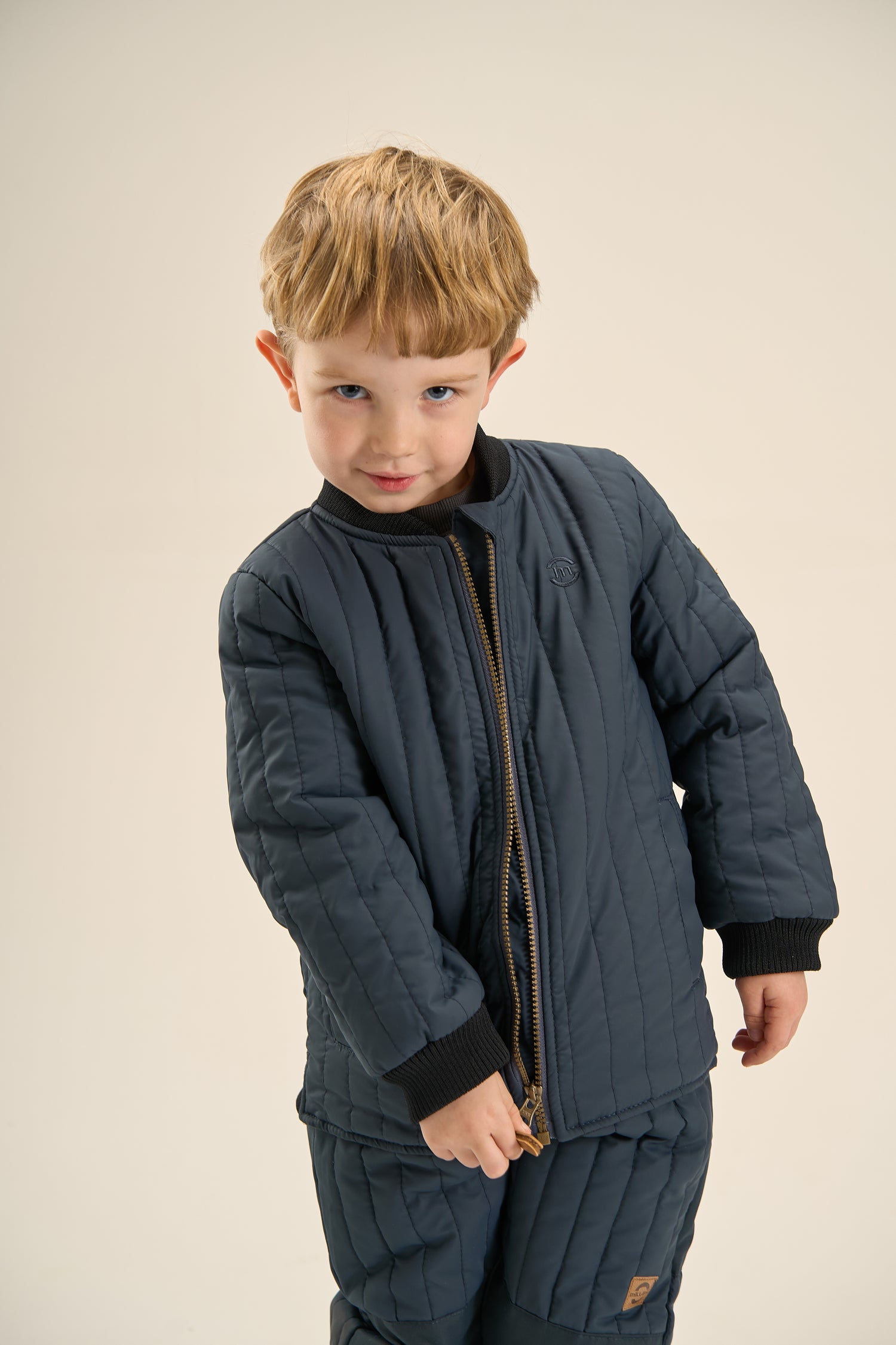 Termosættet har en let, quiltet konstruktion med blød polstring, som giver god isolering uden at fylde for meget. Materialet er slidstærkt og behageligt at have på, og den funktionelle pasform giver barnet god bevægelsesfrihed.
